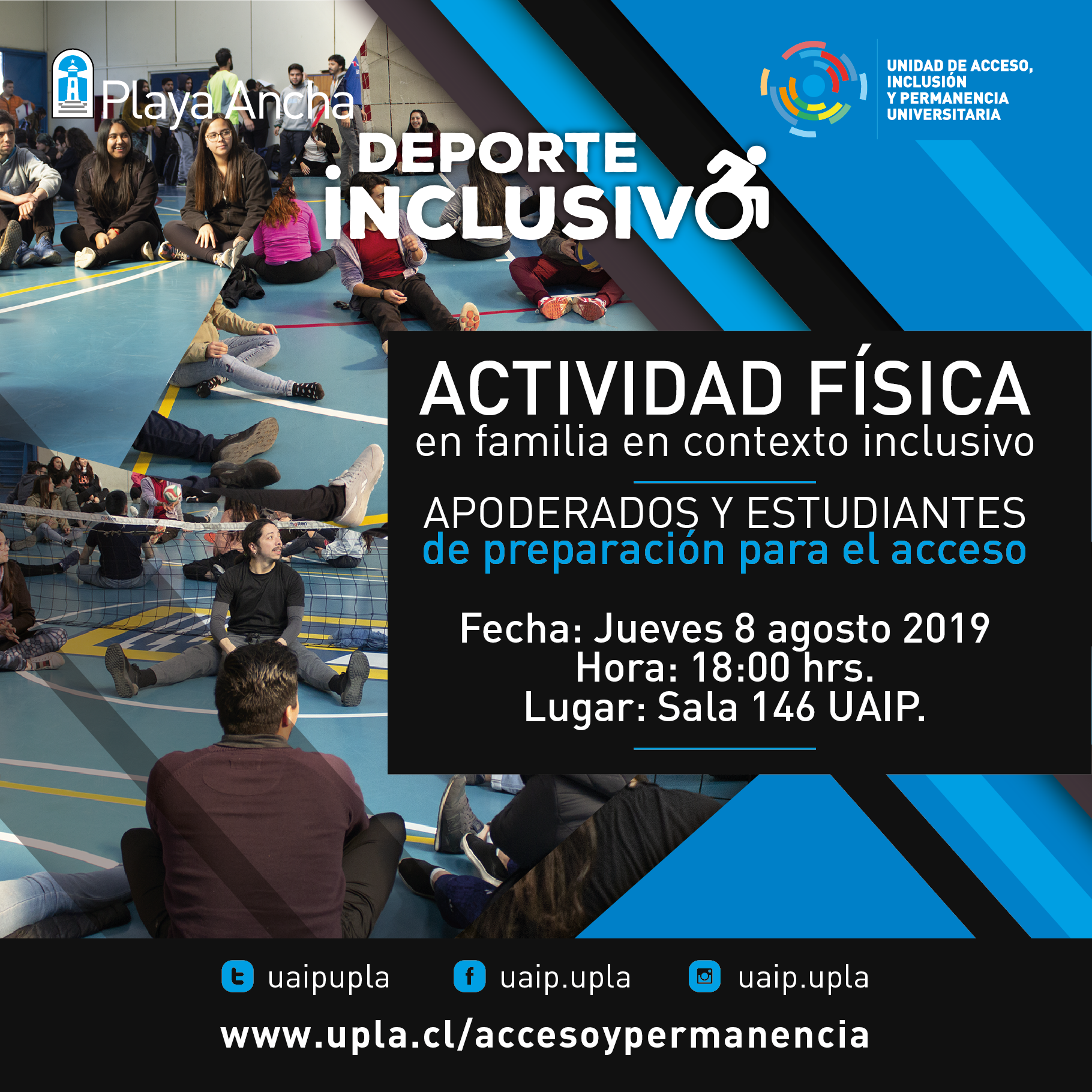 La Unidad de Acceso, Inclusión y Permanencia Universitaria (UAIP) en el marco de la implementación del Plan de Fortalecimiento de Universidades estatales (UPA 1799), desarrolla el Programa de Información y Acompañamiento Parental, e invita a Apoderados y Estudiantes del programa de preparación para el acceso a participar de Actividad física en familia en contexto inclusivo que se desarrollará en articulación con Programa de Deporte Inclusivo el día Jueves 8 de agosto 2019, a las 18:00 horas en la Sala 146 de UAIP