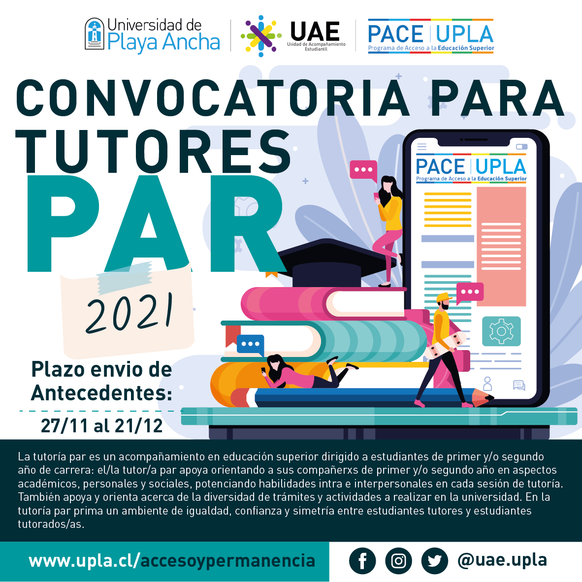 [/vc_column_text][vc_separator type=»small» position=»center» gradient_color=»yes» width=»1px»][vc_column_text]Para el proceso de postulación, debe enviar sus antecedentes en formato de postulación que se acompaña. Estos serán recibidos vía online dirigido a mercedes.perez@upla.cl con copia a tutorpar@upla.cl  Los preseleccionados serán convocados a una entrevista con el fin de conocer sus intereses en este campo y competencias en relación a los procesos de mejoramiento del aprendizaje.[/vc_column_text][vc_column_text css=».vc_custom_1606507639809{padding-top: 30px !important;}»]
