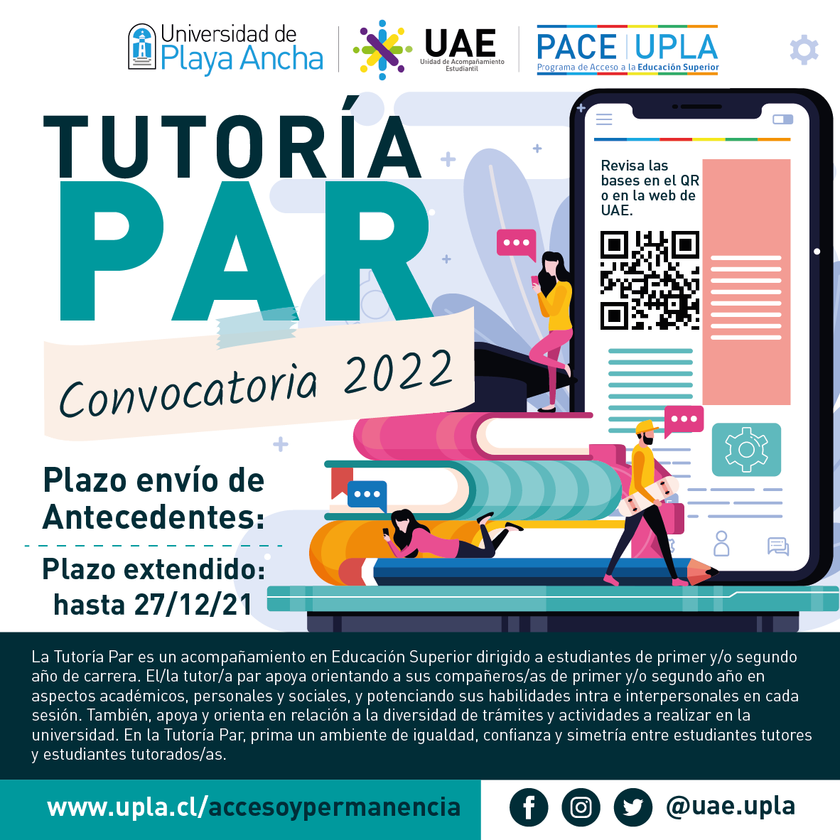 [/vc_column_text][vc_separator type=»small» position=»center» gradient_color=»yes» width=»1px»][vc_column_text]Para el proceso de postulación, debe enviar sus antecedentes en formato de postulación que se acompaña. Estos serán recibidos vía online dirigido a tutorpar@upla.cl Con copia a natalia.villalon@upla.cl Los postulantes preseleccionados serán convocados a una entrevista con el fin de conocer sus intereses en este campo y competencias en relación a los procesos de mediación de aprendizajes.