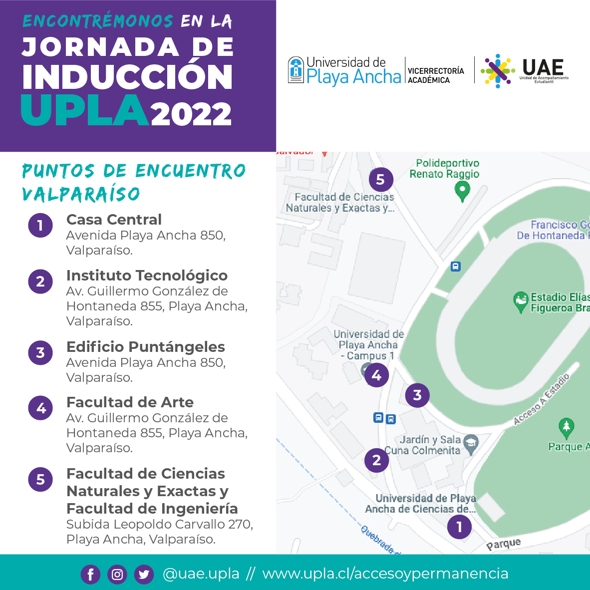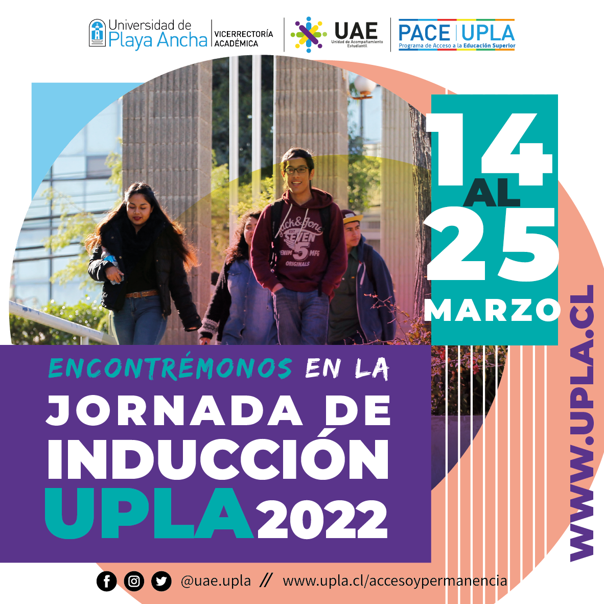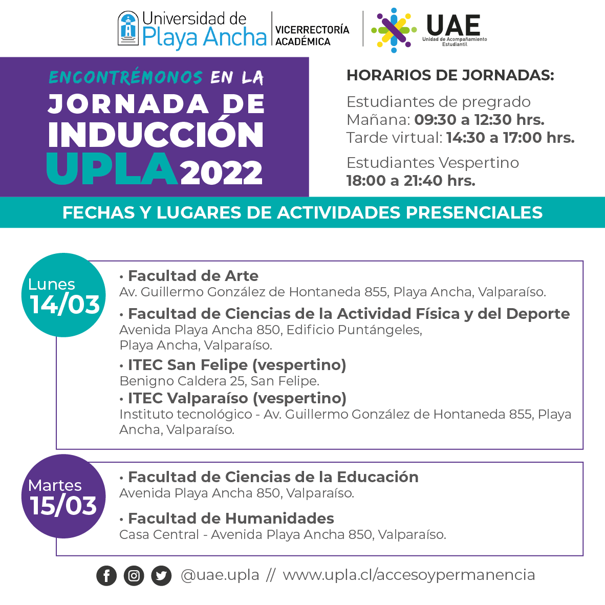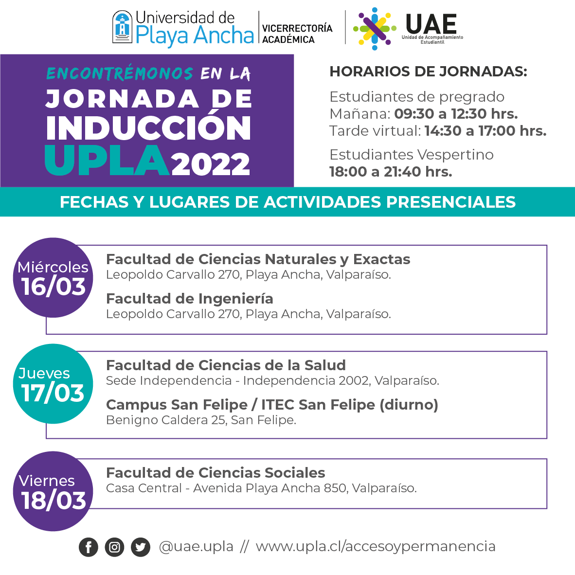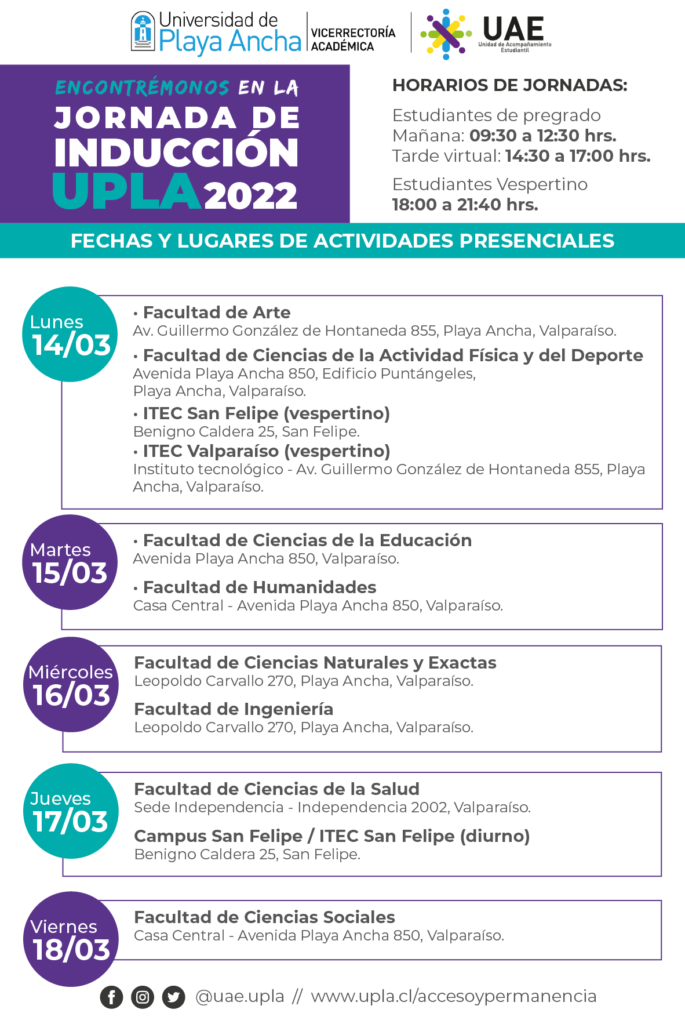 La Unidad de Acompañamiento Estudiantil, dependiente de la Vicerrectoría Académica de la Universidad de Playa Ancha, te recuerda que el Proceso de Inducción 2022 se realizará desde el lunes 14 hasta el viernes 25 de marzo y será de carácter obligatorio.