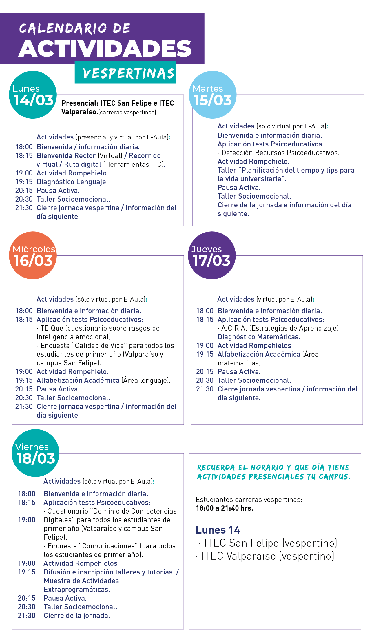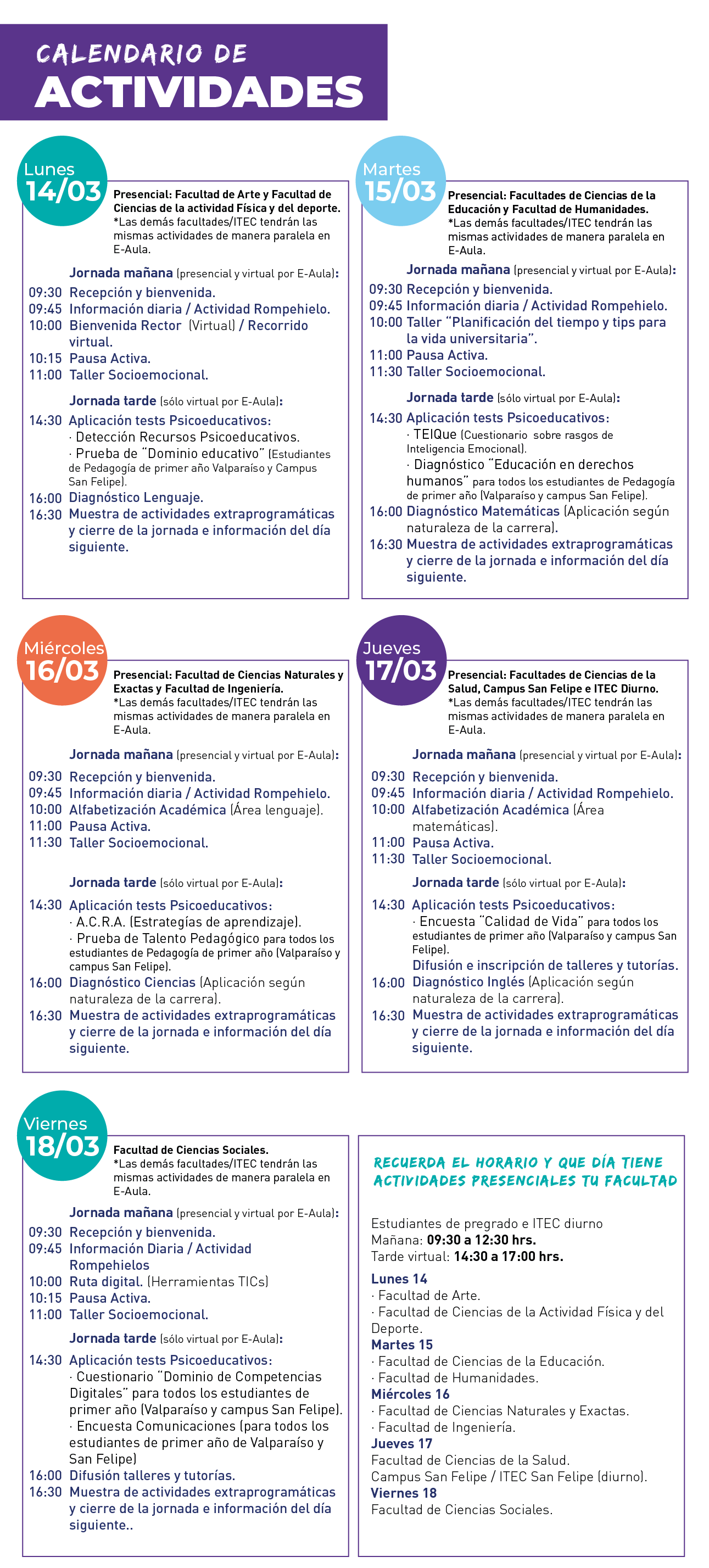 IMPORTANTE: Las actividades que se efectuarán durante la jornada de la mañana serán presenciales, mientras que las de la tarde serán virtuales (E-Aula); y por temas de aforo, cada Facultad/ ITEC (diurno-vespertino) tiene un día asignado: