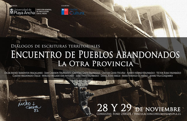El viernes 29 de noviembre el “Encuentro de Pueblos Abandonados: La Otra Provincia” contará con las interpretaciones del territorio por parte de Víctor Rojas (Museos caseros); Mario Verdugo (Curepto es mi concepto. Tópicos y perspectivas de la ficción territorial); Oscar Barrientos (El Martinrivismo: Sujeto orgánico del arribismo nacional); Jaime Pinos (Todo es centro. Hacia una nueva geopolítica cultural); Daniel Rojas Pachas (Imposturas y tránsitos fronterizos en la nueva literatura del norte); y Alberto Madrid (Relectura del criollismo).