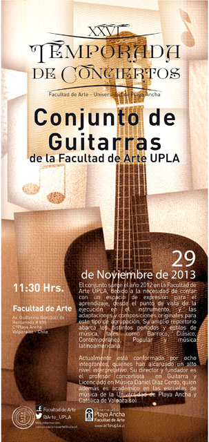 Con la presentación del Conjunto de Guitarras de la Universidad de Playa Ancha cerrará este viernes 29 de noviembre la vigésimo sexta Temporada de Conciertos que organizó la Facultad de Arte UPLA, y que reunió a más de 20 agrupaciones y solistas de la región de Valparaíso.
