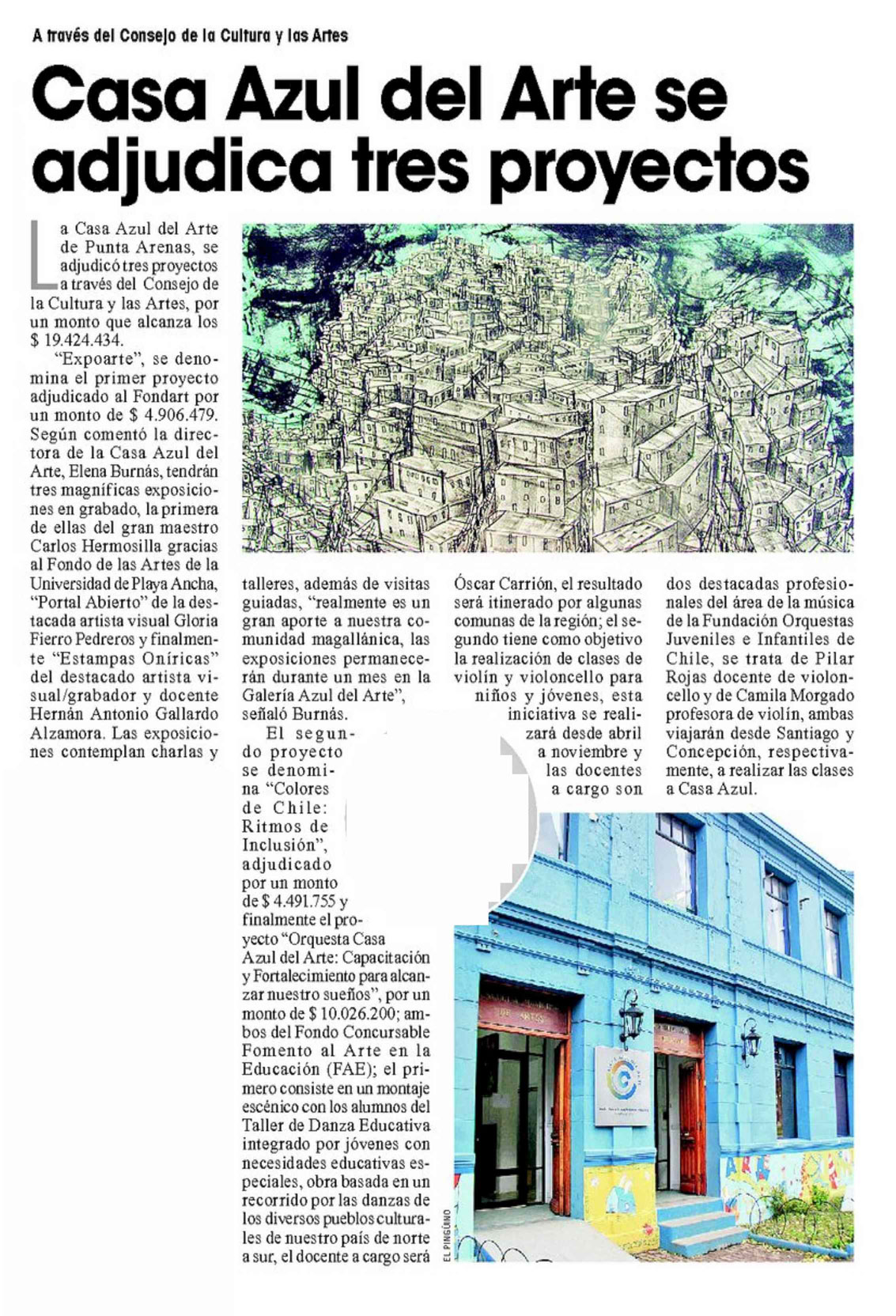 Casa Azul del Arte se adjudica tres proyectosFuente: Diario El Pingüino de Punta Arenas, página 30, publicado el 4 de enero de 2014.