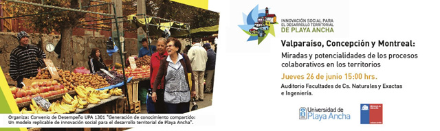 anuncio-upla-940x2802«Valparaíso, Concepción y Montreal: Miradas y potencialidades de los procesos colaborativos en los territorios», es el nombre del coloquio que se realizará el jueves 26 de junio, a las 15 horas, en el Auditorio de las facultades de Ciencias Naturales y Exactas e Ingeniería de la Universidad de Playa Ancha.