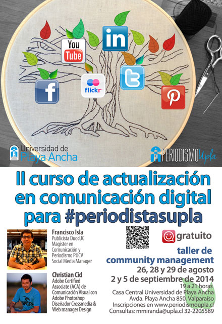 Los relatores son Francisco Isla, socialmedia manager, publicista y magíster en educación y periodismo; y Christian Cid, certificado en Comunicación Visual por Adobe, diseñador y webmanager. El curso es coordinado por la profesora Mg. María de los Ángeles Miranda, periodista y encargada de la línea comunicación digital de la carrera.