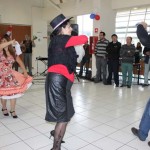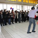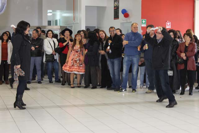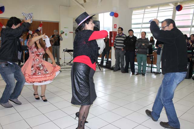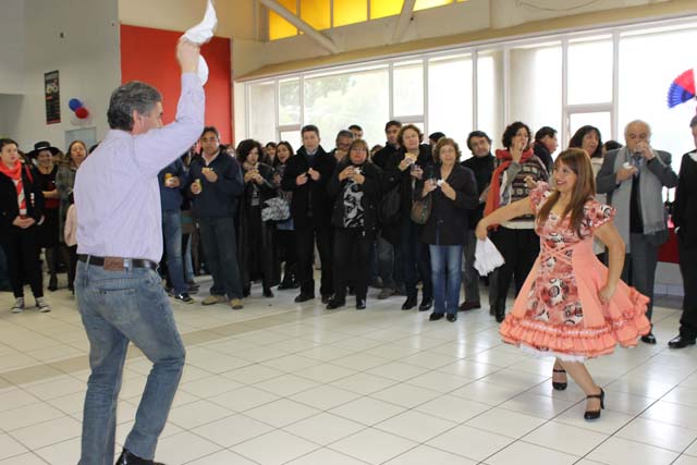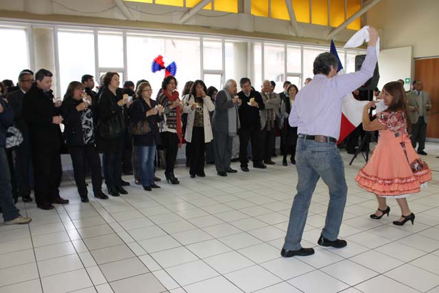 Demostrando cómo se baila la cueca, se presentó la estudiante de Traducción e Interpretación Inglés-Español Constanza Aghemio, quien obtuvo el segundo lugar en el Campeonato Interuniversitario de Cueca que organizó la Universidad de Viña del Mar. La joven dio cuenta de su destreza y carisma acompañada por el profesor Carlos Hernández.