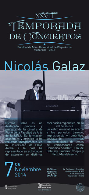 afiche_Nicolas-GalazCon la presentación del pianista y académico UPLA Nicolás Galaz continúa este viernes 7 el ciclo de presentaciones correspondientes al segundo semestre de la vigesimoséptima edición de la Temporada de Conciertos que organiza la Facultad de Arte de la Universidad de Playa Ancha.