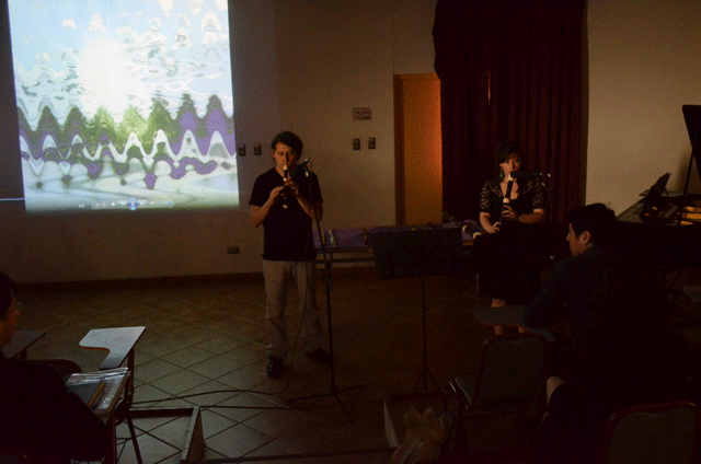 Las obras que presentó el compositor porteño fueron: “Otra remembranza porteña oriental”, tema para ensamble de guitarras eléctricas que mezcla lo popular con lo docto; “Vientos orientales” (obra para flautas) con interpretaciones co-creadas con la docente Javiera Portales, “Minutos de paz 1 y 2”, obra para piano solista que interpretó Constanza Lecaros; una co-creación para ensamble de flautas dulces a cargo de alumnos de la Facultad de Arte; y “Un bosque de guitarras”, obra superpuesta con fondo sonoro que acompañó improvisando Francisco Guzmán.