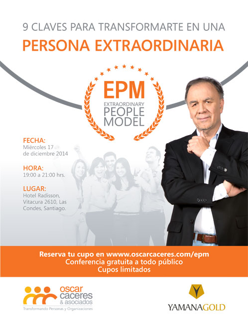 afichecharlaEPMUn novedoso modelo se presentará en el seminario gratuito “Extraordinary People Model (EPM)” que se realizará este miércoles 17, a las 19.00 horas, en el Hotel Radisson de Santiago.