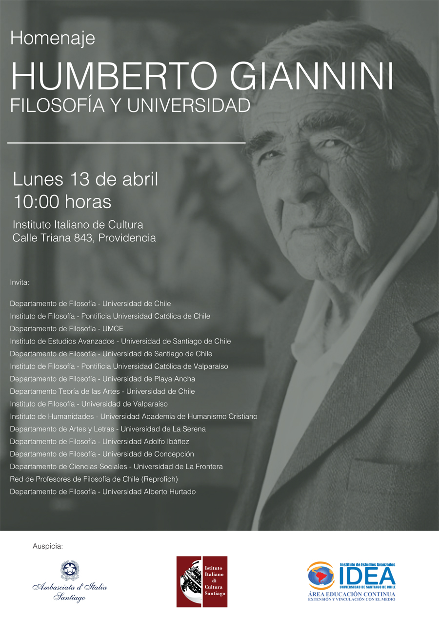 La ceremonia que se realizará el lunes 13 de abril, a las 10.00 horas, en el Instituto Italiano de la Cultura (Triana 843, esquina Eleodoro Yáñez, Providencia) contará con las intervenciones de Carlos Ruiz, Cecilia Sánchez, José Santos y Pablo Oyarzún sobre “Humberto Giannini: Filosofía y Universidad”.