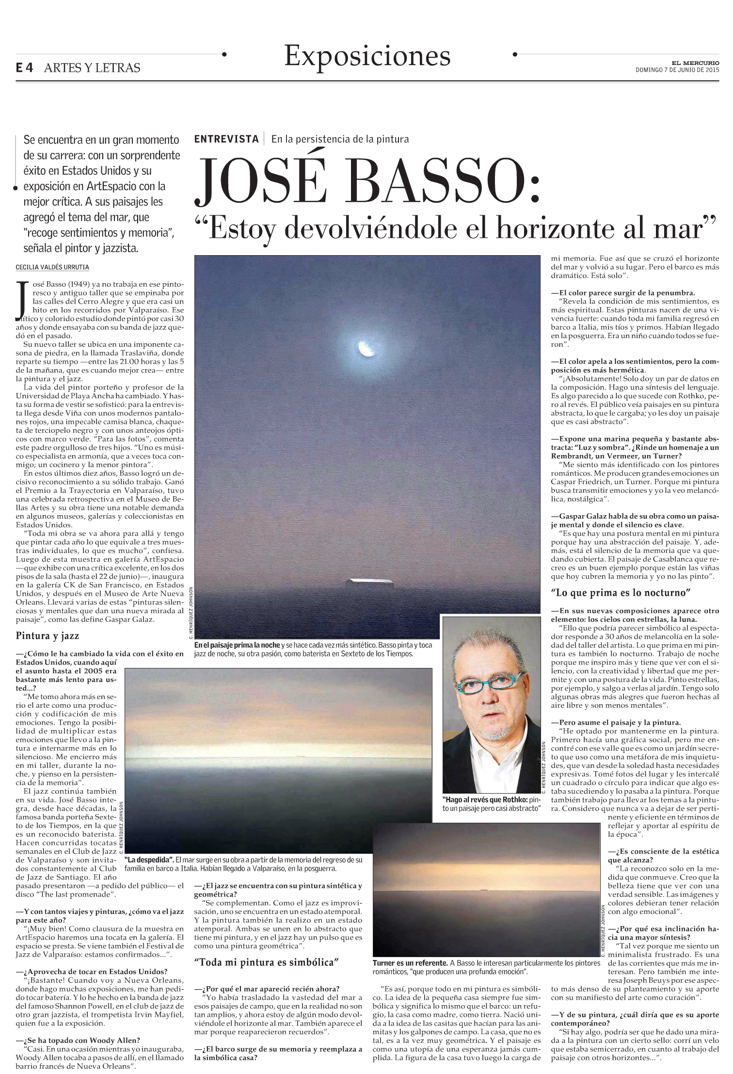 José Basso: «Estoy devolviéndole el horizonte al mar» Fuente: El Mercurio, Artes y Letras, publicado el 7 de junio de 2015, página 4. Comparte tweet