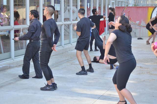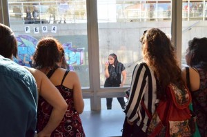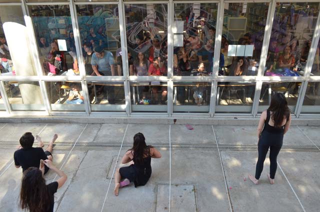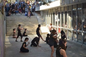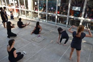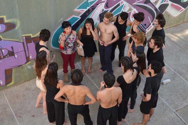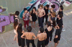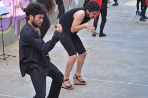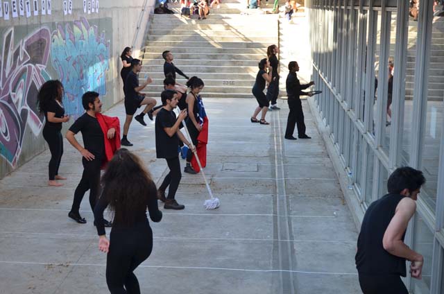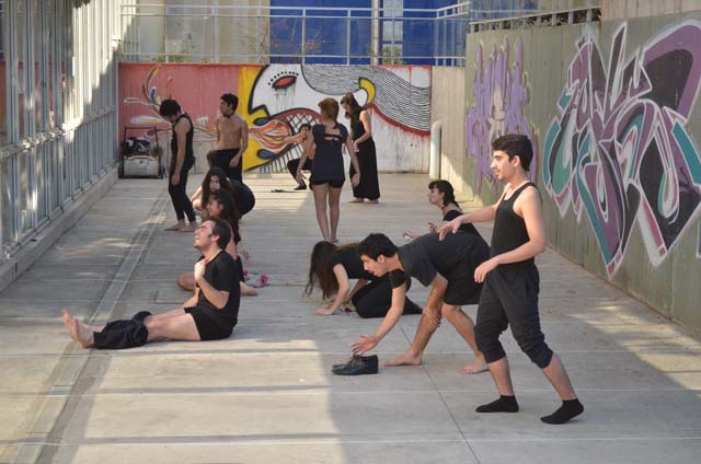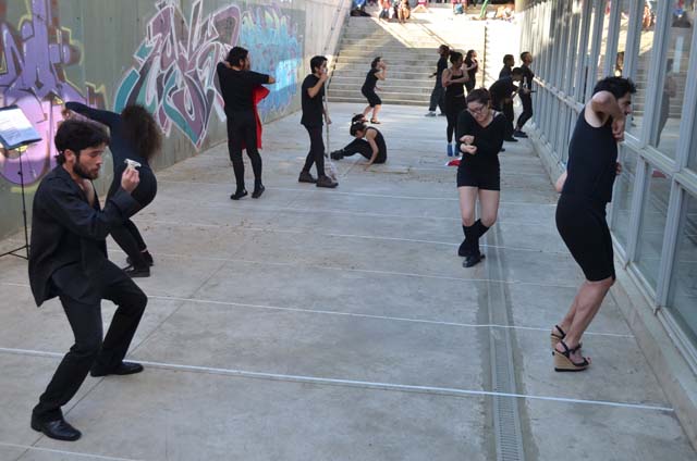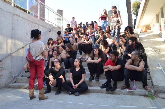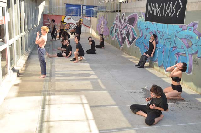 intercatedra_teatro_upla_uchile2015_11Posteriormente cada grupo llevó a la práctica lo aprendido generando dos representaciones diferentes de movimiento que fueron montadas en el patio de la Biblioteca Central. De esta forma, los estudiantes de la Universidad de Playa Ancha plantearon la temática del trabajo en la propuesta “Cuestión de pega”; mientras que los de la Universidad de Chile se basaron en la pregunta ¿quiénes somos? para idear la propuesta “Narcisos”.