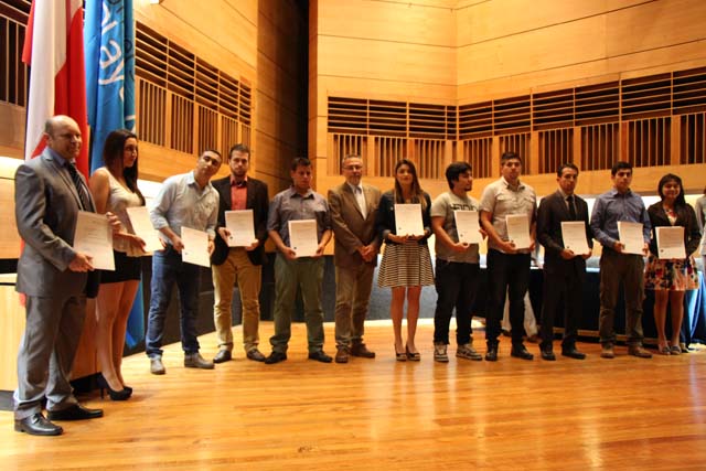 El rector Patricio Sanhueza Vivanco junto a la directora de Gestión Curricular, Catalina Rojas Martínez, felicitaron a los jóvenes que gracias a su esfuerzo y dedicación han alcanzado los mejores niveles de rendimiento en su avance curricular.