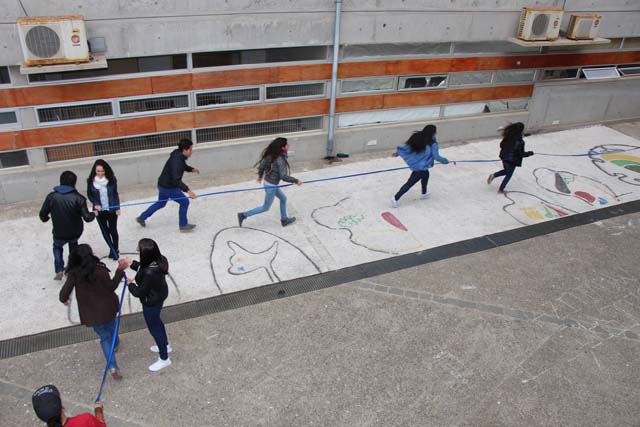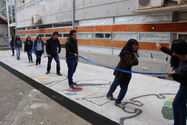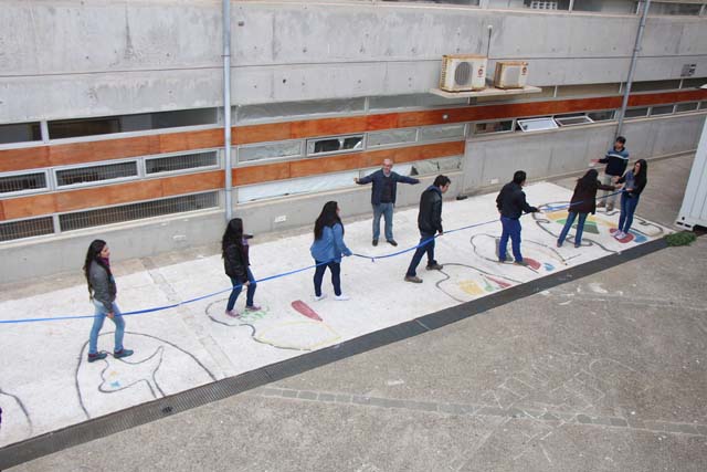 Los estudiantes dibujaron en el patio de la Facultad el entorno neuronal para recorrer las vías nerviosas. Junto con el movimiento, los jóvenes relatan cómo se transmiten los impulsos nerviosos entre neuronas, rol que ellos mismos asumen.