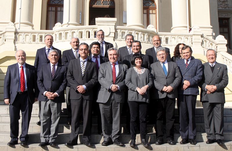 «Digan Valdés», comenta el rector de la U. de Chile, Ennio Vivaldi, al resto de los rectores de las universidades estatales mientras posan para una foto en el frontis del Museo de Arte Contemporáneo, donde acaban de tener una reunión para analizar el proyecto de educación superior.