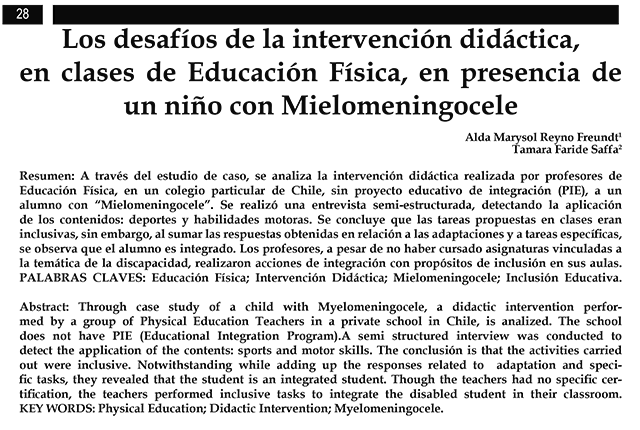 Así comienza el artículo Scielo “Los desafíos de la intervención didáctica en clases de Educación Física, en presencia de un niño con Mielomeningocele” de las académicas Dra. Alda Marysol Reyno Freundt y Mg. Tamara Faride Saffa, que fue publicado por la Revista Mexicana de Orientación Educativa (REMO) en el volumen XIII, Nº 30, enero a junio de 2016.