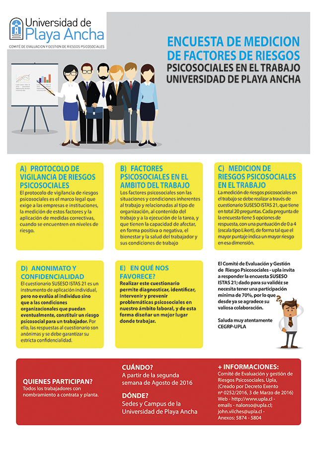 Este lunes 8 de agosto se inició en Gran Bretaña la aplicación de la breve encuesta para los trabajadores de la Universidad de Playa Ancha, a fin de determinar la calidad de la salud psicosocial en el ámbito ocupacional, tanto en Valparaíso como en San Felipe.