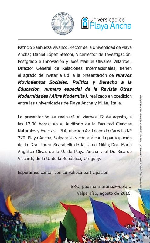 Este viernes 12, a las 12 horas, se realizará en la Universidad de Playa Ancha la presentación de la revista «Otras Modernidades» (Altre Modernità), coeditada por expertos de esta casa de estudios y de la Universidad de Milán, Italia.
