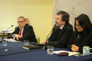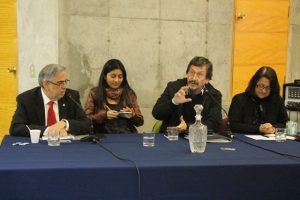 En el primer panel participaron el rector de la Universidad de Santiago de Chile, Juan Manuel Zolezzi; el presidente de la Federación de Académicos de Universidades Estatales de Chile (FAUECH), Carlos Gómez; y la presidenta de la Federación de Estudiantes de la Universidad de Chile, Camila Rojas.