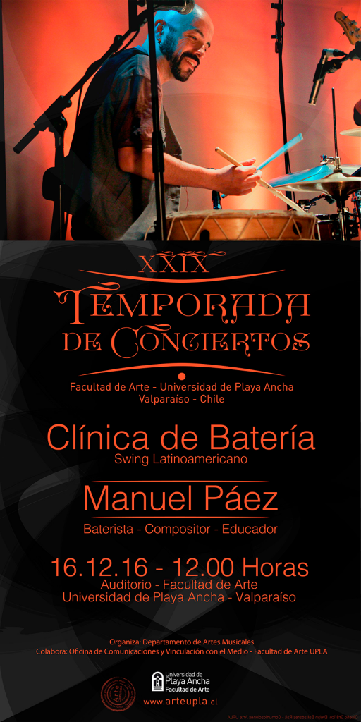 La venida del baterista se circunscribe en la gira denominada “En la Ruta de la Identidad” que Manuel Páez desarrolla en distintos escenarios de nuestro país, y que tras su presentación en la Facultad de Arte contempla una serie de clínicas y conciertos que culminarán en febrero con su participación en las Semanas Musicales de Frutillar 2017.