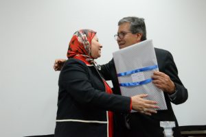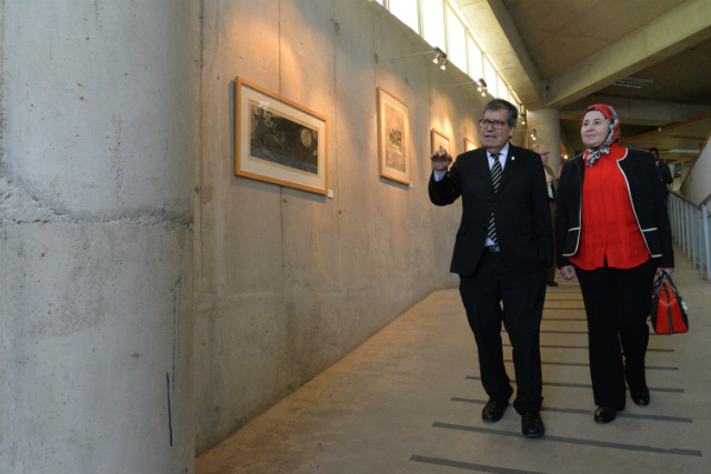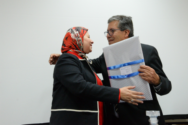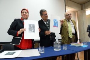 Al término de la ceremonia el rector Sanhueza le hizo entrega a la embajadora El Ghali de tres grabados originales, elaborados por artistas de la Facultad de Arte.