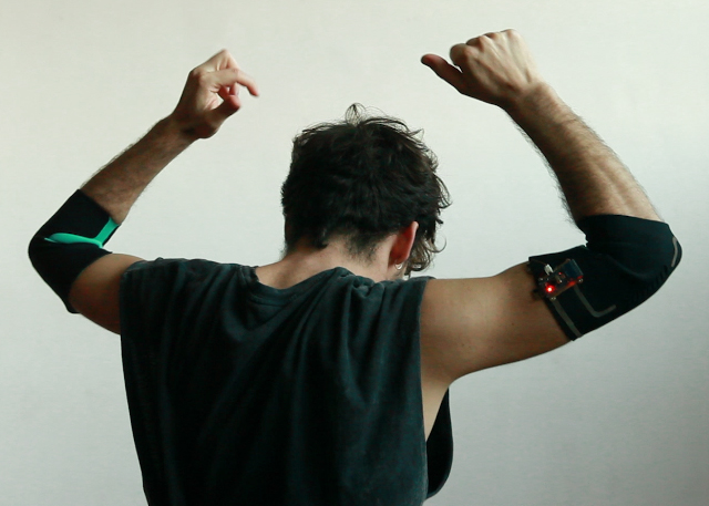 Un bailarín porta una serie de módulos fabricados con materiales conductivos y corte láser, que monitorean el movimiento del cuerpo y lo envían de manera inalámbrica a un ordenador.
