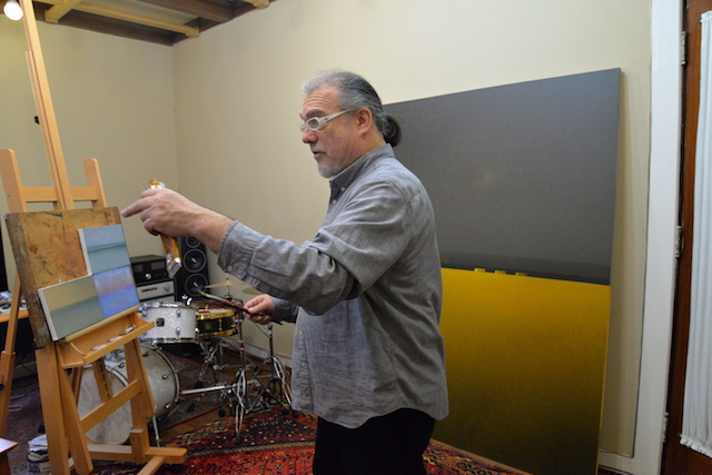 «Curiosamente es lo contrario. Bueno, puede ser, pero rehuyo la composición. Cuando tú partes un plano en dos, ya no estás componiendo, es como seguir sus ejes naturales, central-vertical, central-horizontal, y eso evita la composición clásica como la sección áurea, por ejemplo, cosa que yo enseño en la universidad, pero en mi obra trato que sea lo más neutra posible. Y ahí está… -piensa tres segundos-, ahí está la parte minimalista, porque tengo una tendencia a eso, a no tocar excesivamente el tema del plano completo. Lo interesante de eso es que la persona ve un paisaje real y si yo empiezo a contar eso que estamos hablando se dan cuenta que no tiene nada de realista… Mi trabajo al final sigue siendo el mismo trabajo abstracto del principio».