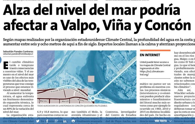 En cuanto a cómo podría afectar un alza del nivel del mar a Valparaíso y Viña del Mar, Winckler aclara que «las ciudades de Valparaíso y Viña se encuentran ubicadas entre 4 a 6 metros sobre el nivel medio del mar, lo que de alguna manera reduce el impacto de los cambios del nivel del mar en las costas. Los efectos podrán notarse en terrenos bajos o donde hay desembocaduras -como en el los ríos Aconcagua, Maipo- o en humedales como El Yali o Mantagua. Lo que sí hemos visto y probablemente sigamos viendo, son efectos puntuales de marejadas recientes sobre la costa, que aún no sabemos si están relacionados con el cambio climático».
