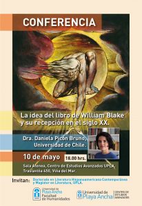 La línea de investigación en literatura comparada del Doctorado de Literatura Hispanoamericana Contemporánea y la mención de literatura inglesa y norteamericana del Magíster en Literatura de la Universidad de Playa Ancha invitan a la conferencia “La idea del libro de William Blake y su recepción en el siglo XX”, que impartirá la académica de la Universidad de Chile, Dra. Daniela Picón Bruno.
