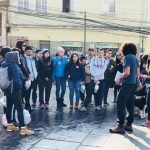 El recorrido fue guiado por estudiantes de la carrera de Administración Turística Multilingüe y comenzó con una caminata desde Plaza Aduana, continuando por el plan del barrio Puerto, Plaza Sotomayor, Muelle Prat y Tribunales de Justicia.
