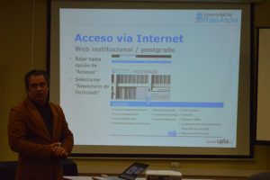 El académico y desarrollador de recursos interactivos y multimediales de la Dirección de Educación Virtual UPLA, Fabián González Araya, explicó el funcionamiento del repositorio, su interfaz informática y gráfica, y en qué plataformas y dispositivos móviles se puede acceder y utilizar. Posteriormente, Lina Besaccia Page, profesional del Sistema de Bibliotecas y quien actúo en el proyecto como experta en gestión de la información bibliográfica dio cuenta de los componentes documentales del repositorio e instó a los presentes a participar activamente en la incorporación de nuevos documentos que sean de interés de estudiantes y académicos del doctorado.