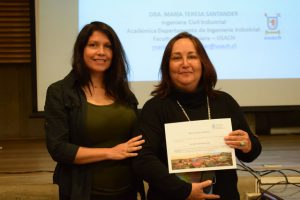 Al término de la Clase Magistral «Ingeniería y Mujeres», la decana Verónica Meza Ramírez le entregó un presente a la Dra. María Teresa Santander Gana.