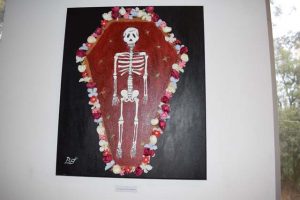 Desde el 2015 que Sofía tenía una idea en su cabeza, la que se convirtió en primer cuadro, que da cuenta de un paralelo entre un cerro porteño con sus casas en forma de cascada y un cerro iquiqueño con su petroglifos. Luego siguieron las calaveras y Joaquín Edwards Bello: “En mis pinturas la idea de las calaveras es hacer que los sujetos se identifiquen con ellas, no tienen carne. No son masculinas, ni femeninas, son sujetos andrógenos. Así como yo me identifiqué con Joaquín Edwards Bello, quien ejerció una gran inspiración para pintar estos cuadros”, dijo la joven artista.
