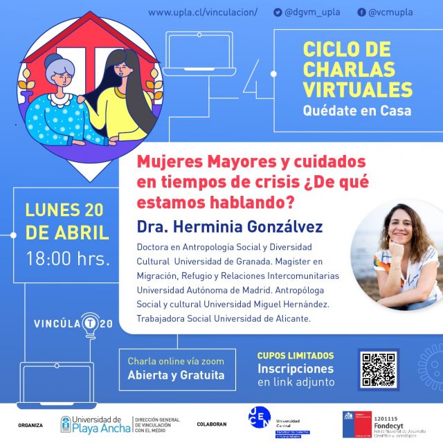 Para hablar sobre los cuidados y el autocuidado de las personas mayores, con especial énfasis en el rol que cumplen las mujeres de la tercera edad, la Doctora en Antropología Social de la Universidad de Granada y académica de la Universidad Central de Chile, Herminia Gonzálvez Torralbo, se reunirá con todos quienes participen vía Zoom, en el marco del ciclo de charlas virtuales “Quédate en Casa” organizado por la Dirección General de Vinculación con el Medio de la UPLA.