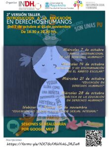 El objetivo de este ciclo de talleres, que tuvo su primera versión en junio de 2019, es entregar herramientas teóricas y prácticas para quienes trabajan en contextos de educación formal, no formal e informal, sobre la Educación en Derechos Humanos, con el fin de promover agentes de cambio que construyan desde los diversos espacios educativos una cultura de derechos humanos.