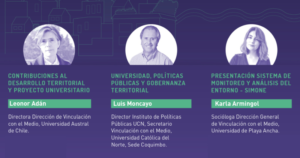 La tercera intervención la realizó Karla Armingol, profesional de la Dirección General de Vinculación con el Medio de la Universidad de Playa Ancha, quien presentó a los participantes el Sistema de Monitoreo y Análisis del Entorno, SIMONE. Se trata de una herramienta digital de libre acceso creada por la UPLA como apoyo y soporte a la labor de vinculación con el medio de esta casa de estudios, que contribuye y fortalece el trabajo colaborativo.