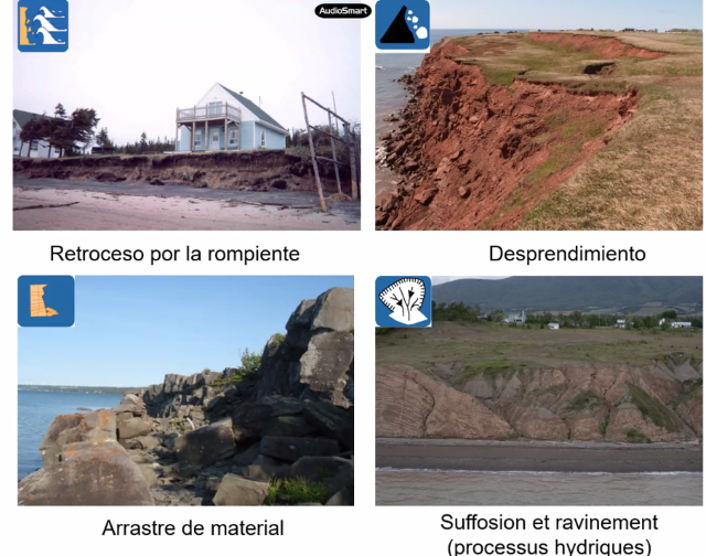 Entre ellos mencionó la erosión costera. Existen amplios sectores de la costa muy activos, que presentan desprendimiento, hay muchos terrenos del litoral constituidos por arena en los que se genera vaciamiento de arena y arcilla, así como muchos acantilados móviles. Está también la inundación de territorios por el avance del mar, sobrepasando la línea de construcción, y la originalidad de Quebec, que es la acumulación de hielo en el mar, que va erosionando la costa.