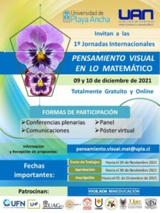 La Universidad de Playa Ancha en Chile y los programas de Doctorado y Maestría en Educación Matemática de la Universidad Antonio Nariño en Colombia convocan a las Primeras Jornadas Internacionales “Pensamiento Visual en lo Matemático”, a realizarse el 9 de diciembre, entre las 15 y 18 horas, y el 10 de diciembre de 202, entre las 9 y 18 horas (Chile).