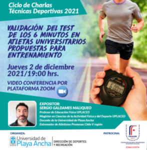 La quinta charla de este ciclo se titula «Validación del Test de los 6 minutos en atletas universitarios. Propuestas para entrenamiento» y se efectuará por la plataforma Zoom, el jueves 2 de diciembre, a las 19:00 horas. El relator será Sergio Galdames Maliqueo, profesor de Educación Física y magíster en Ciencias de la Actividad Física y del Deporte UPLA.