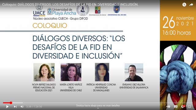 Con la exposición de la Dra. Nolfa Ibañez Salgado, Premio Nacional de Educación 2021, la Mg. María Loreto Muñoz Villa, la académica Patricia Henríquez Concha y Dr. Emiliano Diez Villorria (Universidad de Salamanca) el Grupo de investigación en Diversidad e Inclusión en la Formación Docente (DIFOD) realizó el coloquio “Diálogos diversos: los desafíos de la FID (Formación Inicial Docente) en diversidad e inclusión”.