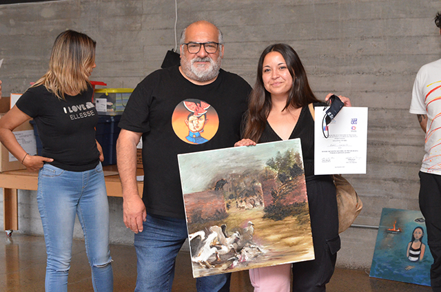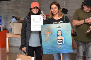 Gabriela Flores Campos, premiada en la categoría Emergente y exalumna de Licenciatura en Artes UPLA, llegó desde Hijuelas para reencontrase con artistas porteños y para vivir la experiencia de pintar. “La idea, los elementos y la composición de mi trabajo surgieron en el momento, dando como resultado una obra figurativa con un relato poético donde represento a una mujer sumergida en el mar, con un pez en la cabeza y un barco incendiándose. Por ello estoy muy agradecida con el concurso, su proceso y por tener la posibilidad de aprender del trabajo de otros artistas que están en la misma sintonía”, reafirmó.