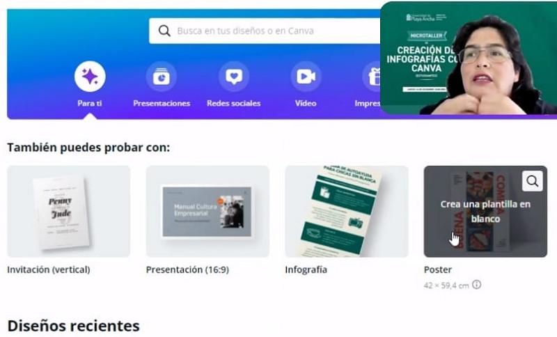 “Cuando se entra por primera vez a Canva, se ve una barra en la parte superior, la cual está compuesta por el inicio, la plantillas, los recursos y los planes. También una barra lateral, donde estarán la papelera, las carpetas, los documentos compartidos y el historial de tus diseños. Cabe destacar que todo elemento en Canva es editable y, al igual que otros programas como Photoshop, tiene una funcionalidad de capas”, señaló Alburquenque.