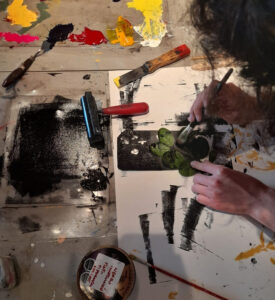 Este taller estará enfocado en una técnica de grabado ecológico que es amigable con el medio ambiente, en la que no se utilizan materiales contaminantes como metales, sales o ácidos mordientes para realizar las matrices, sino que materiales reciclables como el tetra pack, bandejas de plumavit, goma eva, como también plantas y flores para realizar la obra.