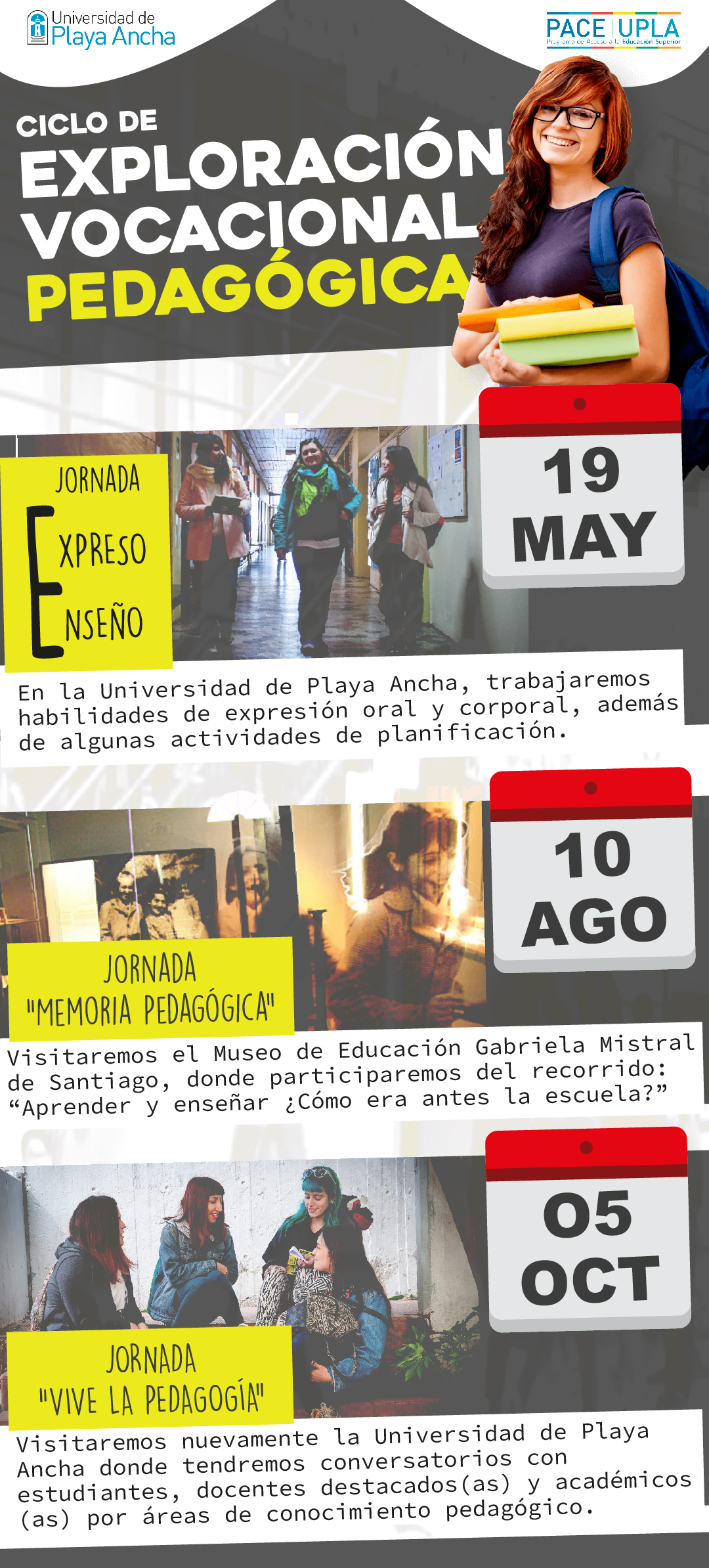 Las siguientes dos jornadas tituladas “Memoria pedagógica” y “Vive la Pedagogía” se programaron para el 10 de agosto y 5 de octubre, respectivamente, momentos en los que se considerará un recorrido presencial por el Museo de la Educación Gabriela Mistral, así como un acercamiento a diversas áreas disciplinares de la Pedagogía, según los intereses vocacionales de los jóvenes, junto con la aplicación de habilidades reconocidas y potenciadas durante el ciclo de la Exploración Vocacional Pedagógica.