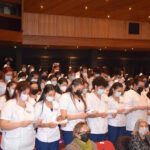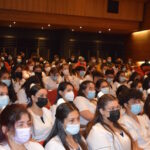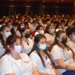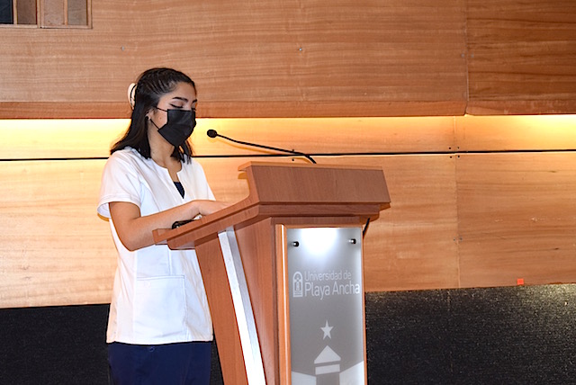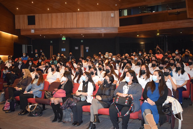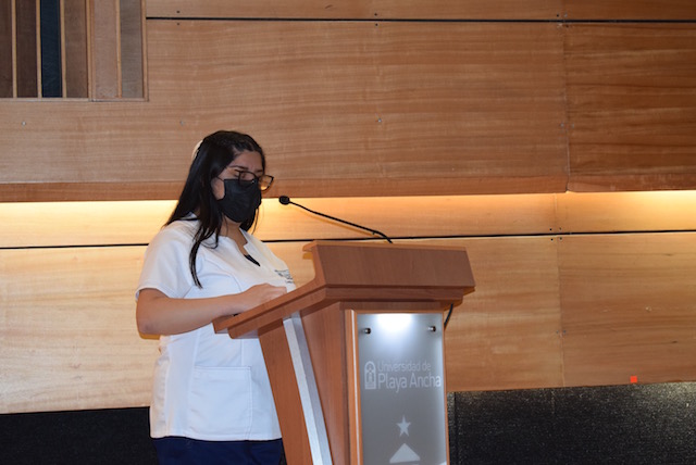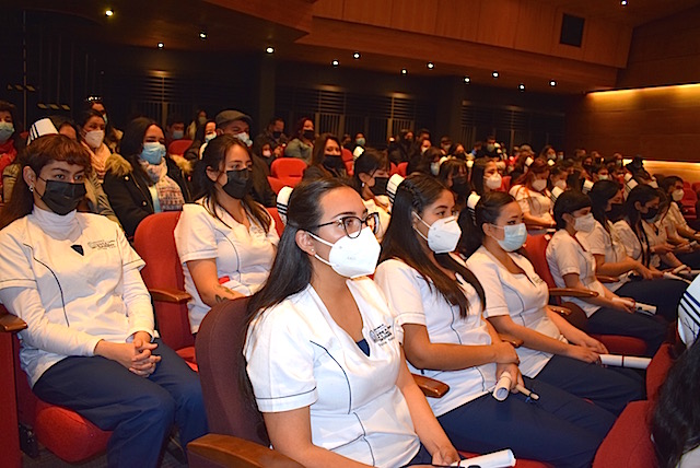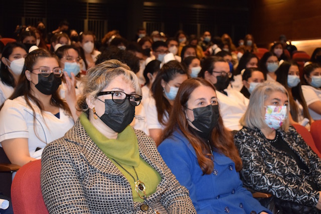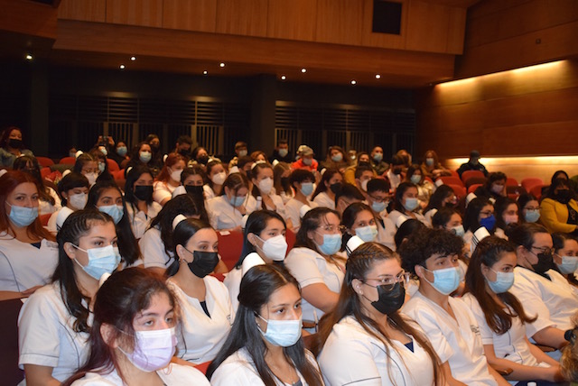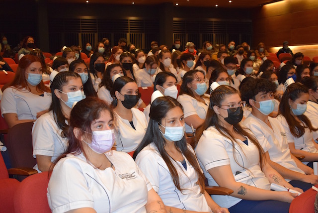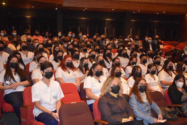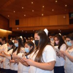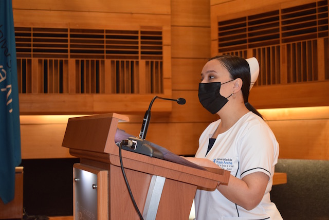 “Hoy, por primera vez visten el uniforme de Enfermería, marca de manera simbólica el inicio de sus prácticas y el compromiso al cuidado de las personas, con ética, empatía, humanidad, responsabilidad y respeto. También quiero mencionar a las familias y amigos que los acompañan hoy con su cariño y apoyo”, dijo la decana.