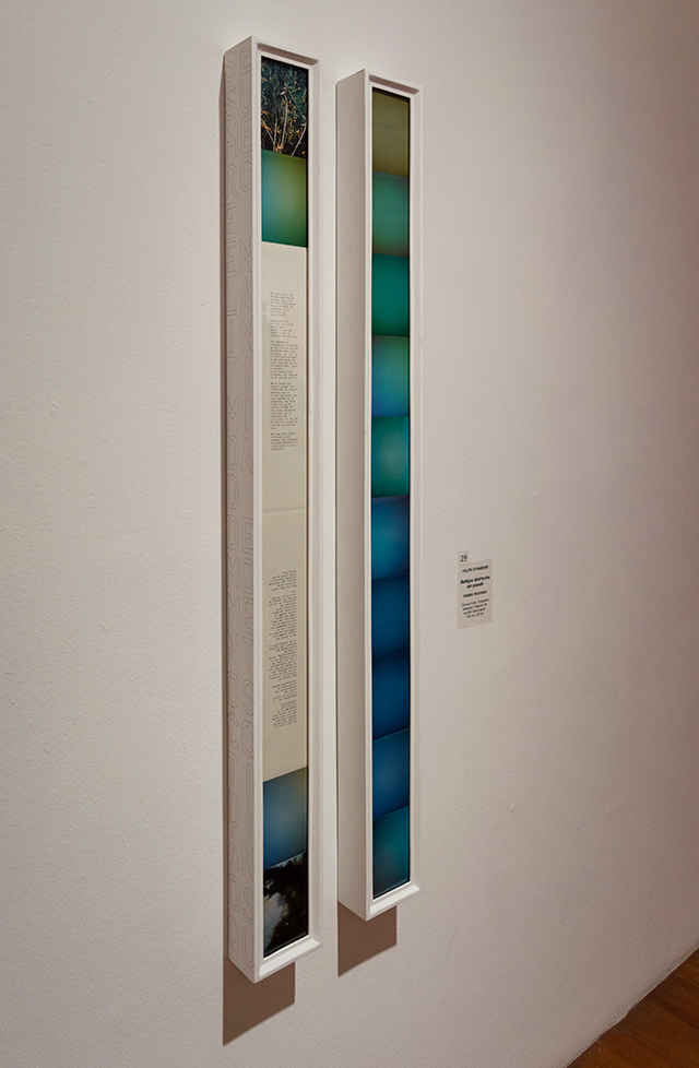 Felipe Oyaneder (28) explicó que la obra ganadora de esta importante distinción es en resumen un díptico análogo que mezcla la fotografía de 35 mm y la máquina de escribir. “Esta mezcla pretende o lleva a una reflexión sobre el agua como espejo que deja ver espacios recónditos de nuestra mente”.