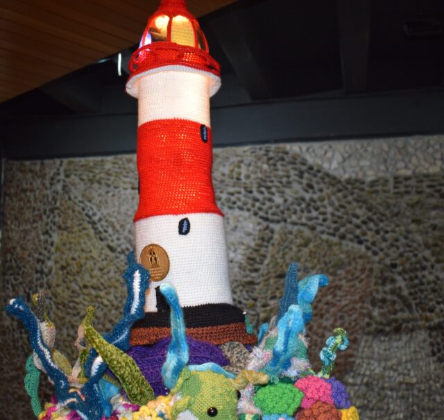 En efecto, se trata de una gran obra tejida a crochet, representando al Faro Puntángeles y a sus pies un arrecife de coral con sus variadas formas de vida, tejidos a crochet punto por punto bajo la guía de las docentes Mirta Moraga y Gabriela Peñailillo, del Departamento de Matemáticas y Estadística de la UFRO.