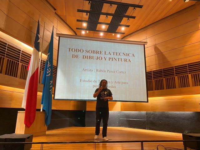 Cristóbal Cisternas, un artista nacido y criado en Salamanca que también llegó a la Universidad de Playa Ancha a presentar su trabajo, contó que lleva siete años realizando talleres de pintura para personas de todas las edades en su ciudad natal y que, este tipo de instancias, le permiten ampliar la extensión de su trabajo, junto con potenciar y visibilizar a la comunidad sorda.