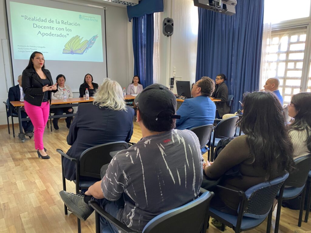 La presentación de la profesora Nadia Cortez Moyano se tituló: “Realidad de la relación de los docentes con los apoderados”, y estuvo orientada a examinar las subjetividades que surgen tanto en docentes como en apoderados, así como las estrategias para fortalecer el vínculo entre estos agentes de la comunidad educativa.